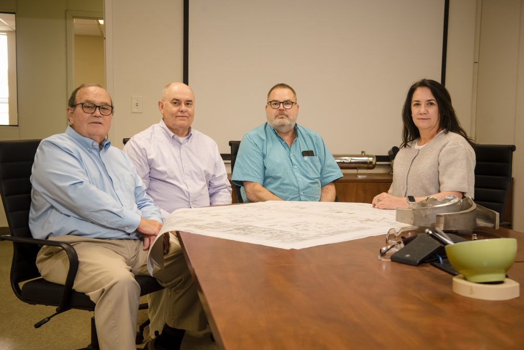 Don Clark alongside Scott Woolard, Quality Manager; Sam Webster, Project Manager; and Melissa Simons, Vice President of Sales, reviewing documentation for an upcoming project.